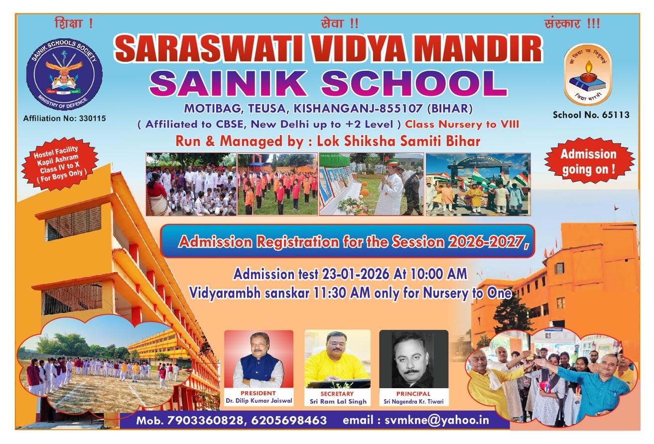 Saraswati Vidya Mandir, Kishanganj, with its comprehensive vision of a 'happy school with a blend of values, tradition, technology and a quest for excellence' stands committed to imparting quality education for the holistic development of the children. The school provides a healthy platform which helps the students to weigh the opportunities for growth, both at the personal and social levels, a school that is known for its distinct culture, policies and practices, a school that represents a vibrancy, exuberance, and sensitivity to the needs of all stakeholders. Our school’s approach illustrates the inter-relationship of all disciplines of knowledge, promotes social and reflective thinking, and fosters the ability to face the myriad challenges of life comfortably.
